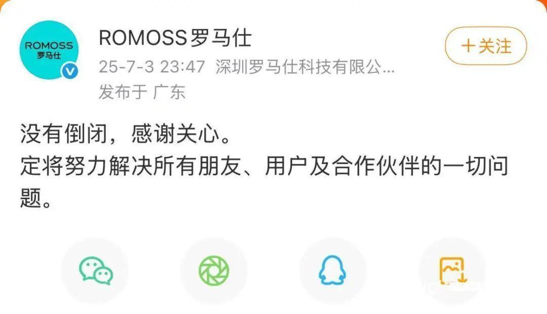针对被传陷经营困境一事,7月3日,深圳充电宝品牌罗马仕在官方微博发布声明称,“没有倒闭,感谢关心。定将努力解决所有朋友、用户及合作伙伴的一切问题。”